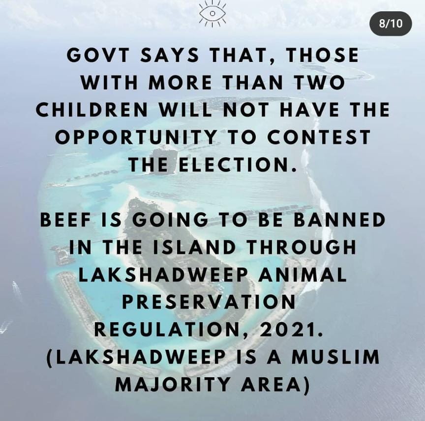 🙅🏻♂️ Lakshadweep: Acting administrator Praful Patel under fire from two MPs over drafting rules for mandatory acquiring private property, police can detain anyone, removed beef from mid-day meal, cut trees for roads and introduced a 2-child norm for contesting local body polls. BJP and Patel say that “only the corrupt were upset” and that all moves were part of “development” agenda..