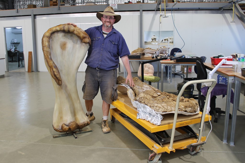 The bones were found at a place called Cooper Creek, hence the nickname “Cooper”.How big was Cooper? About the length of a basketball court and as big as a two-storey building.Kids vs Cooper’s rear legPaleontologist Dr Scott Hocknull with 3D reconstruction and bone of ‘Cooper’s’ humerus