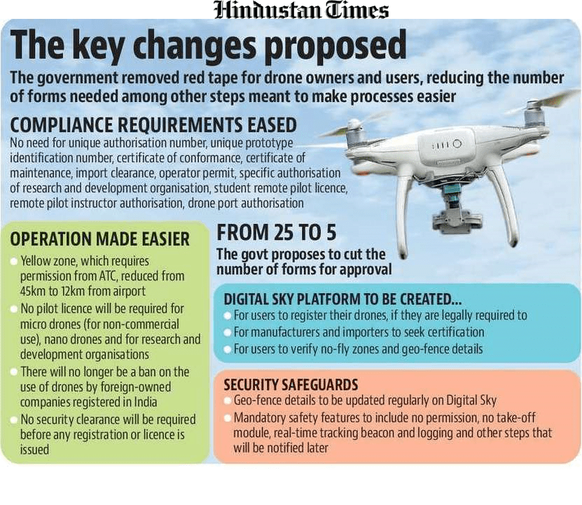 National Drone Policy: People now can own and operate a drone more easily with the Centre releasing a draft copy of the policy. A digital platform will help users register, companies to seek clarification and operators to check no-fly zones.