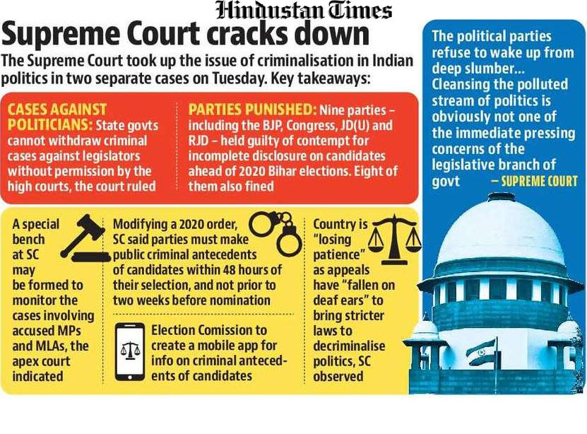 Wings Clipped: States will no longer be able to drop criminal cases against MPs and MLAs without the nod from high courts, said the Supreme Court. It asked political parties to make public the criminal antecedent of its candidates 48 hrs after selection. BJP and Congress are among nine political parties penalised for contempt as they did not fully disclose details of the candidates’ prior to 2020 Bihar elections.